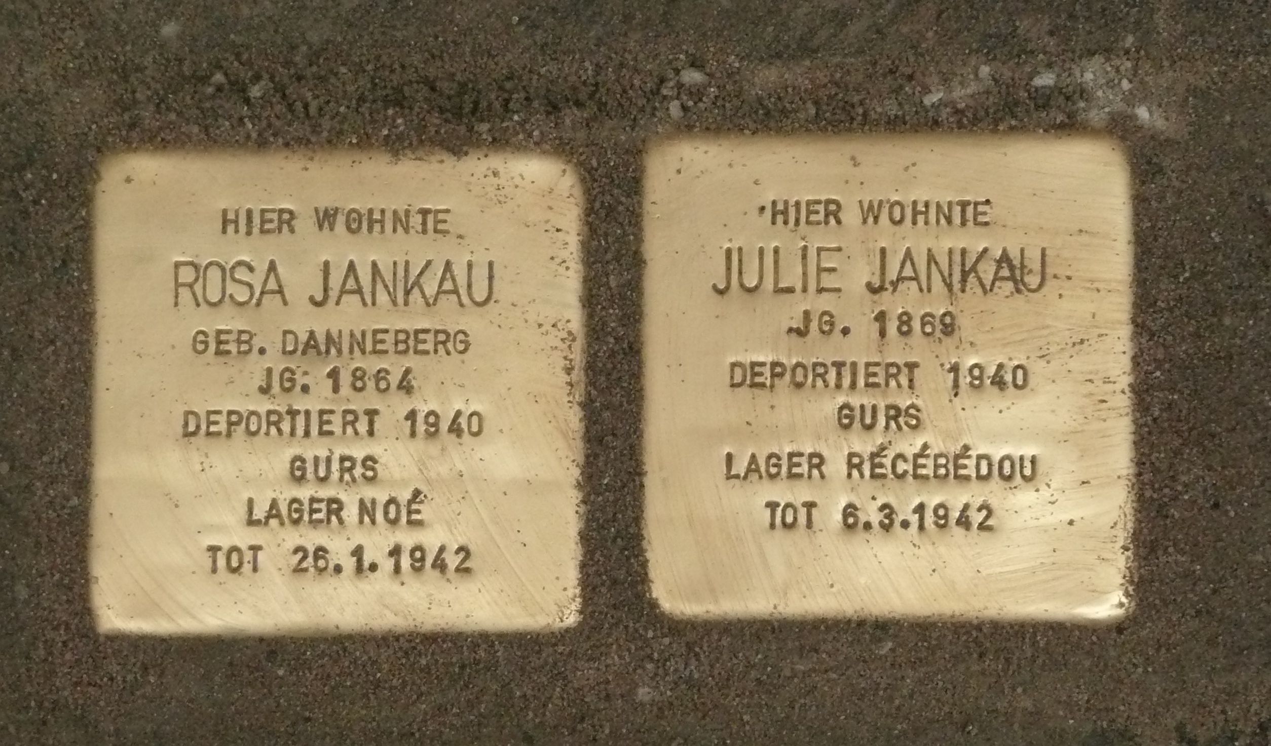 Über Julie Jankau, geb. am 18.12.1863 in Hemsbach, ist wenig dokumentiert. Im katholischen Kirchenbuch ist bei ihrem Geburtseintrag ein Vermerk des Amtsgerichts Weinheim festgehalten, dass sie zum 01.01.1939 den zusätzlichen Vornamen "Sara" angenommen hat. Seit 1927 lebte sie in Heidelberg im Haus der Bäckerei Seligmann in der Plöck 34. Nach dem Verkauf der Bäckerein im Jahre 1938 im Zuge der "Arisierung" zog sie in die Nachbarschaft in die Nadlerstraße 1 und anschließend in die Landfriedstraße 14. Von dort aus wurde sie am 22.10.1940 mit den anderen siebzehn jüdischen Bewohnern nach Gurs deportiert und starb am 06.03.1942 im Lager Récébédou. Sie wurde 78 Jahre alt.