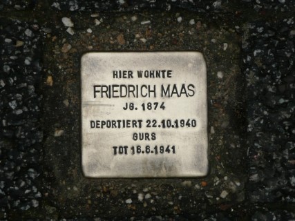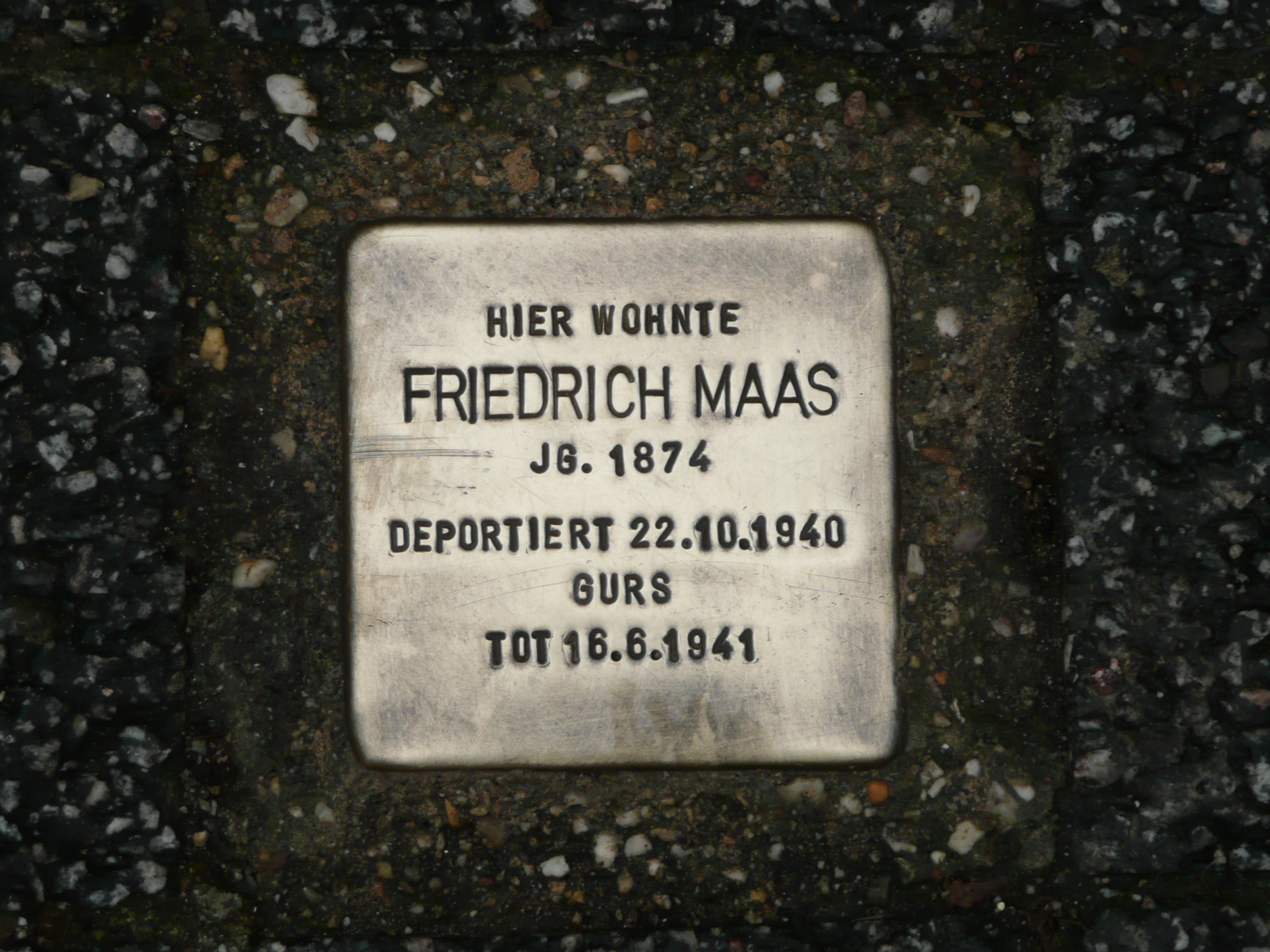 Über seine Biografie ist wenig bekannt. Er wurde am 4.11.1874 als Sohn von Leopold (Löb) Maas II und seiner Frau Hannchen, geb. Oppenheimer, in Hemsbach geboren. Das Elternhaus lag Ecke Schlossgasse und Herrengasse. Friedrichs Schwester Lina starb vor 1938, ihr Mann 1939. Friedrich Maas wurde am 22.10.1940 nach Gurs deportiert. Er lebte unter den katastrophalen Lebensbedingungen im Lager Gurs nur noch ein halbes Jahr und starb dort am 16.6.1941 mit 67 Jahren.