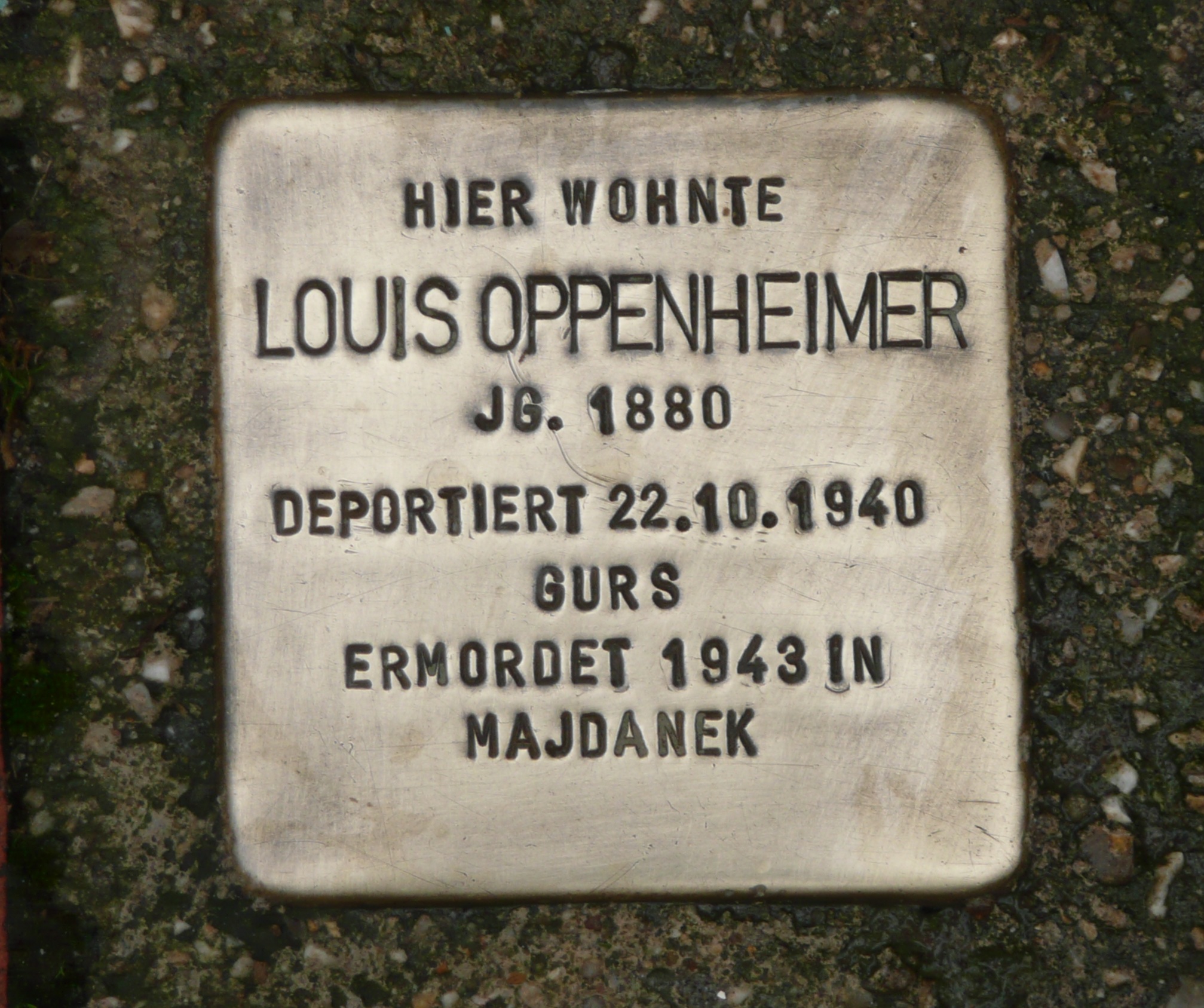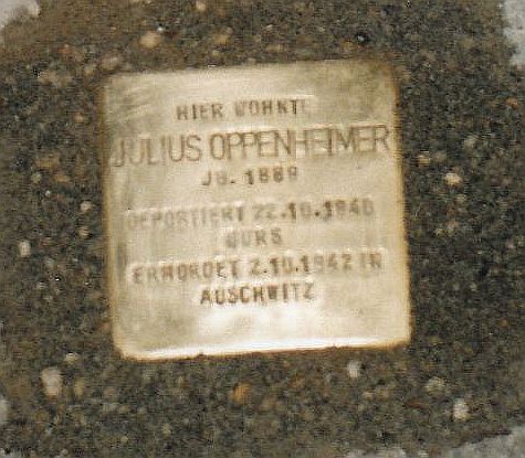 Julius Oppenheimer wurde am 22.10.1940 in das Lager Gurs deportiert, dessen Schrecken er überlebte. Aus den Berichten des überlebenden Oskar Althausen, der in derselben Baracke lebte, geht hervor, dass Louis und Julius Oppenheimer im Winter 1940/41 oft um den sogenannten „kalten Ofen“ herumstanden und in ihrer Sehnsucht nach der Heimat deutsche Heimatlieder sangen. Sie stritten sich sogar darum, wer sie „wenn Hitler einmal kaputt ist“ am Bahnhof empfangen würde, welche Kapelle wohl spielen würde, die der Feuerwehr oder eine andere.