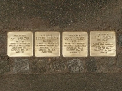 Karl (1895) und Helene Pfälzer (1896 geb. Plaut) gehörten zu den Hemsbacher Juden, die Grundbesitz hatten, im landwirtschaftlichen Produktenhandel tätig waren. Sie hatten also durchaus ihr Auskommen, aber sie verstanden 1935 die Zeichen der Zeit besser als andere jüdische Zeitgenossen und ließen alles im Stich, um mit Verwandten aus Darmstadt, den Wechslers, nach Holland zu gehen. Sie nahmen natürlich ihre 12 Jahre alte Tochter Irmgard (1923) und die 9-jährige Beate (1926) mit auf die ungewisse Reise. Es gelang ihnen tatsächlich, relativ schnell Fuß zu fassen und sie eröffneten in Amsterdam eine gutgehende Bäckerei.
