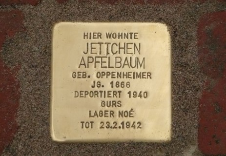 Jettchen Apfelbaum, am 22.6.1866 in Fränkisch-Krumbach als Jettchen Oppenheimer geboren, lebte seit 1905 in Hemsbach und bewohnte mit ihrer Tochter Dora ein kleines Haus in der Bachgasse 55, das inzwischen abgerissen wurde. Jettchen betrieb einen kleinen Laden, dessen Gewinn nur sehr gering war. Sie wurden von der Jüdischen Gemeinde unterstützt, außerdem erhielten sie von Verwandten aus Berlin eine Unterhaltsstütze.